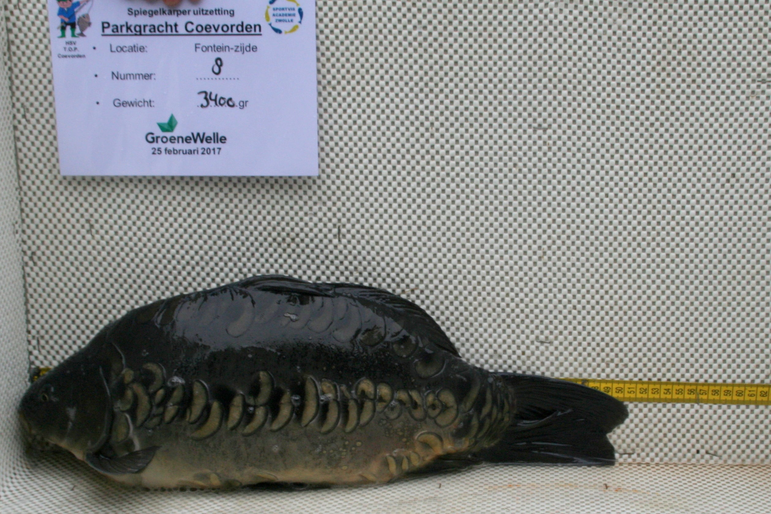 Het uitzetten van de speciaal gekweekte spiegelkarpers is een feit. Maar liefst 27 van deze schitterende vissen hebben een nieuw onderkomen in onze mooie Parkgrachten. Hieronder staan de foto’s van de uitgezette vissen. Zowel de linker- als de rechterflank is gefotografeerd. Op deze manier kunnen de vissers hun gevangen karpers opzoeken en dit melden.